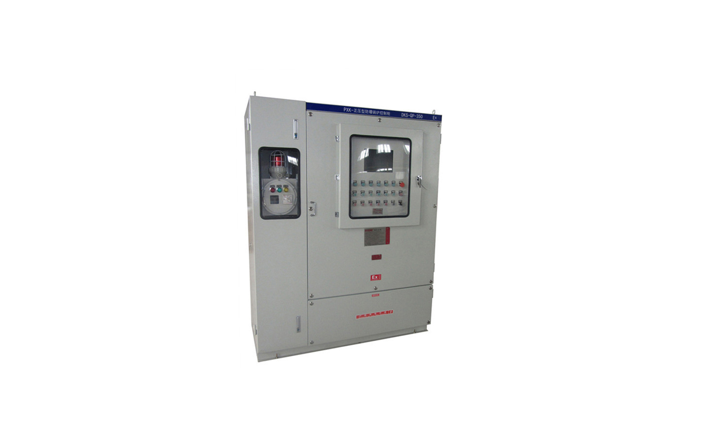 采用介質(zhì)隔離點燃源的防爆措施。即:把用戶所用的電器元件安裝在一個充滿正壓潔凈氣體的柜體內(nèi),使外部環(huán)境中易燃易爆的混合性氣體無法接觸到電器元件在正常工作時所產(chǎn)生的電火花或危險溫度,從而達到電器防爆的目的。